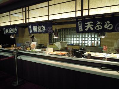 夕食はバイキング、出来立ての天婦羅や綱焼き、鉄板焼きが楽しめる。他に食材が実に豊富、ビール・ハイボール、日本酒が進みました。