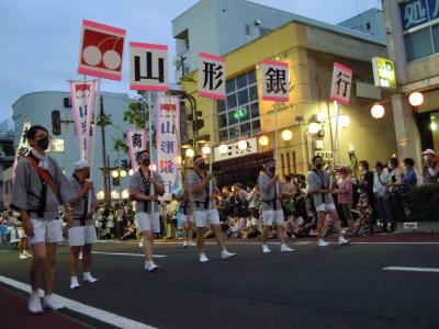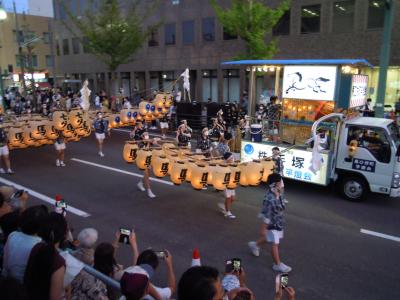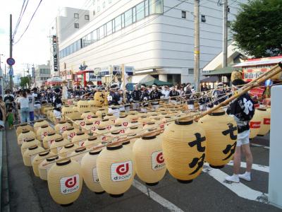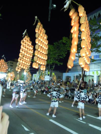 「夜空に揺れる、黄金の稲穂」、稲穂に見立てた竿灯が夏の夜空に揺らめき、五穀豊穣を祈願する。46個の提灯を吊るした「大若」(長さ12m、重さ50kg)を手のひら、額、肩、腰などに移し替える妙味が見どころで伝統の技が発揮されている。「ドッコイショ」の掛け声宜しくたくさんの竿灯が夏祭りの雰囲気を盛り上げていた。