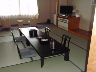 落ち着いた和室(10畳)+テーブル・椅子有りの部屋、トイレはウォッシュレット付、清潔感ある部屋でゆったり過ごせました。