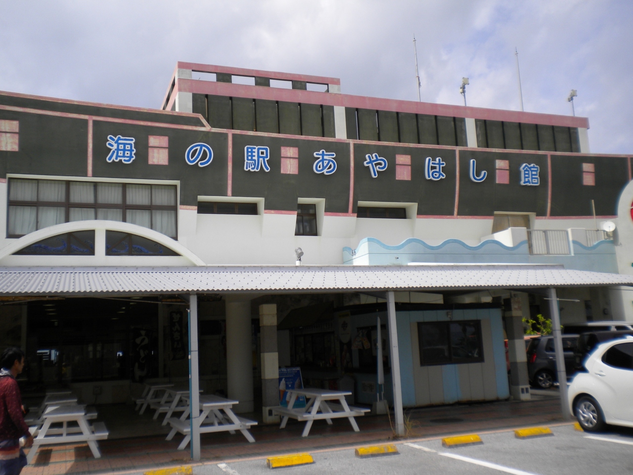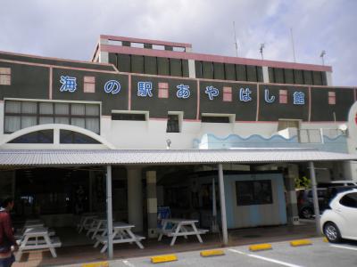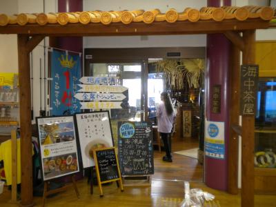 読谷村の「ゆんた市場」からレンタカーを飛ばし、絶景を求めて海中道路へ。その入口にある「海の駅・あやはし館」の中にある「海中茶屋」で小休止。