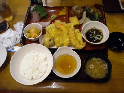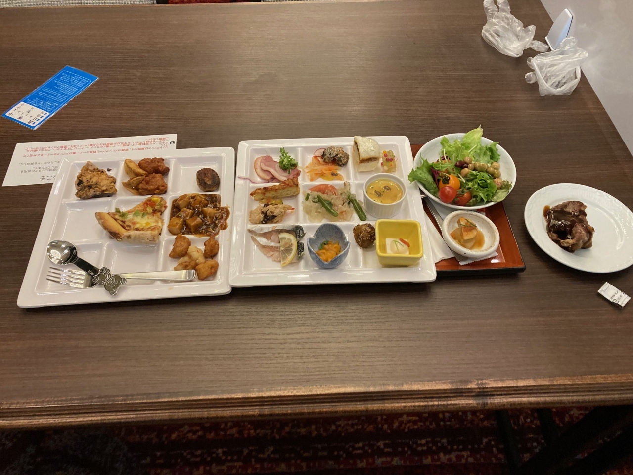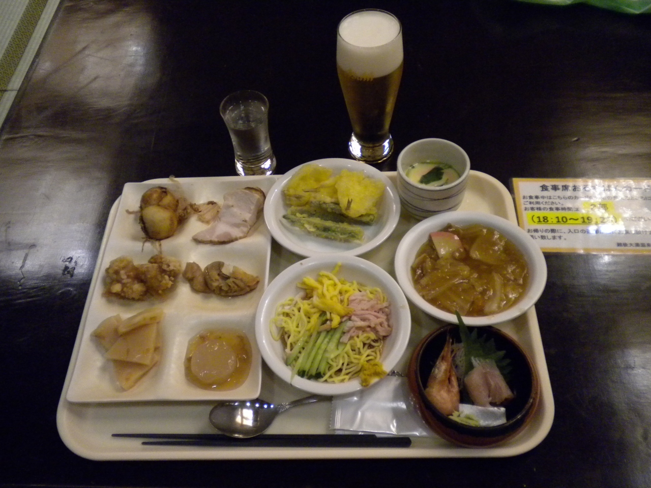 待望の夕食は「赤城ポークと赤城鶏のステーキフェォア」他にてんぷら・刺身等食材豊富、さらにアルコール70分飲み放題(ビール・ハイボール・地酒)で食が進みました。