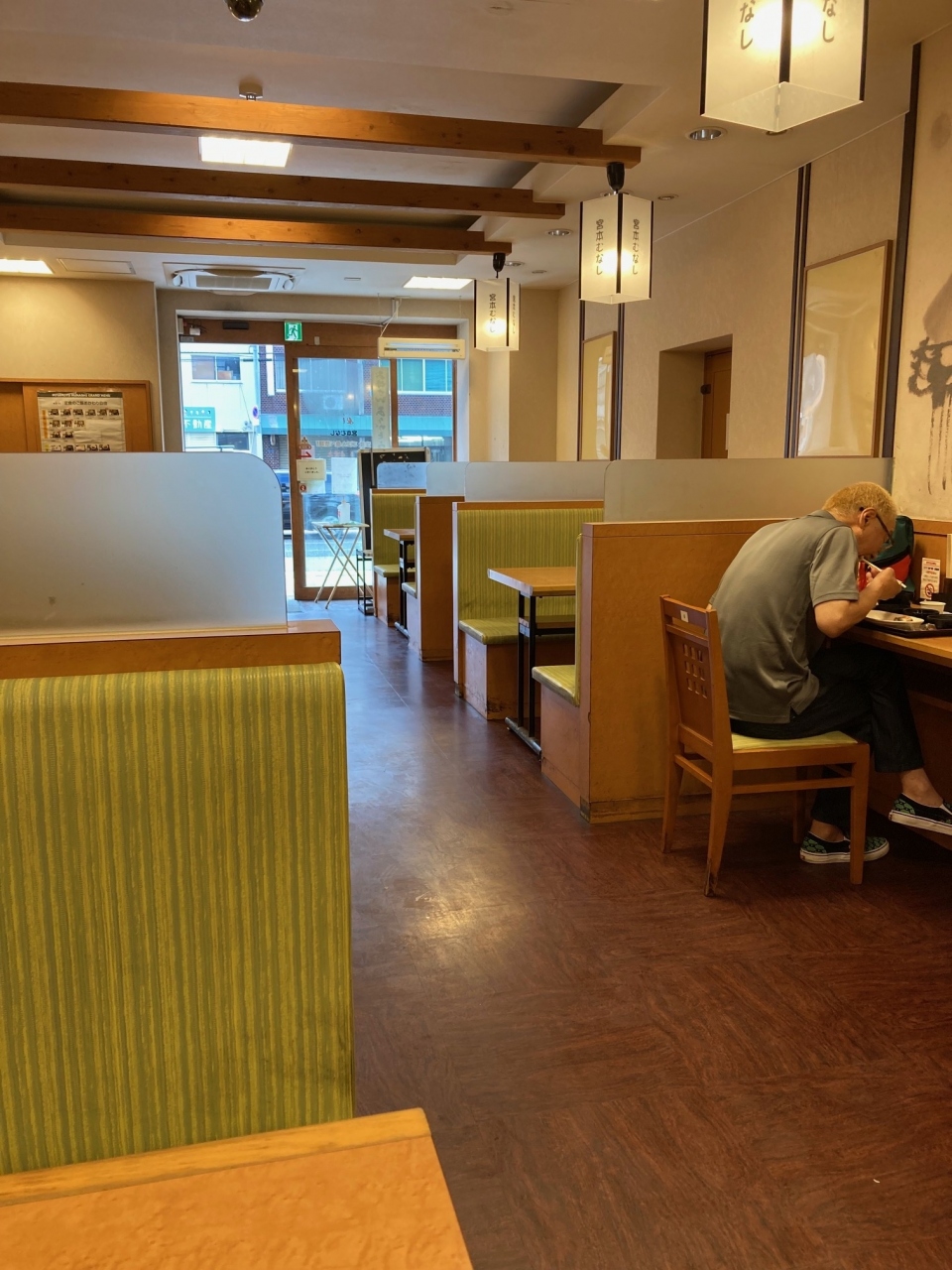 朝食はホテル近くの食事処「宮本むなし」で目玉焼きとウィンナー定食。