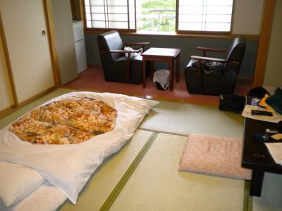 部屋はシングル洋室12㎡、一人旅には十分な広さでベッドは150cm幅のダブルベッドでぐっすり眠れる。他にテーブル・椅子、WIFI・ウォッシュレットも設置されている。
