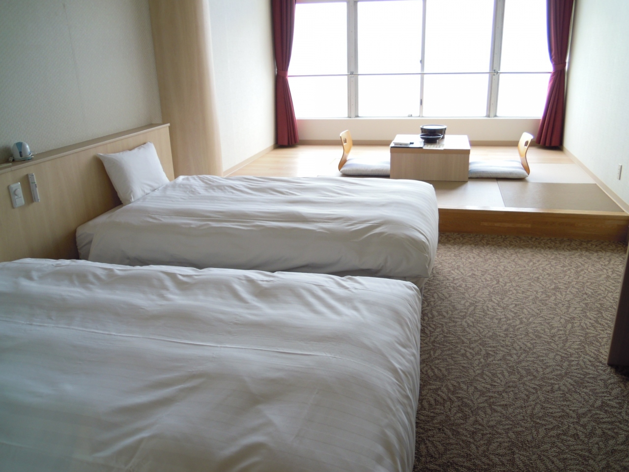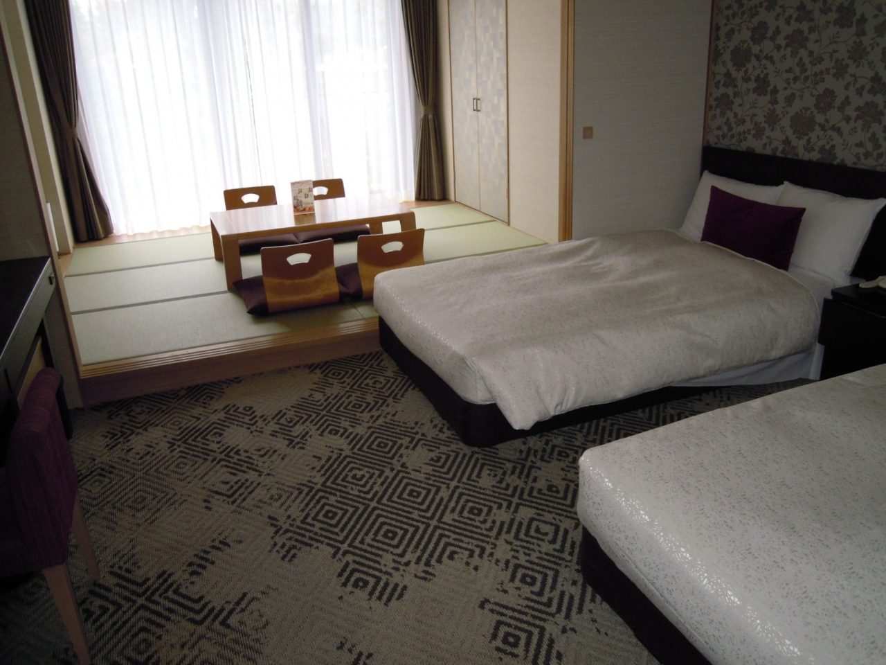 部屋は広々としたツインベッドルーム+畳敷きスペースの和洋室。
