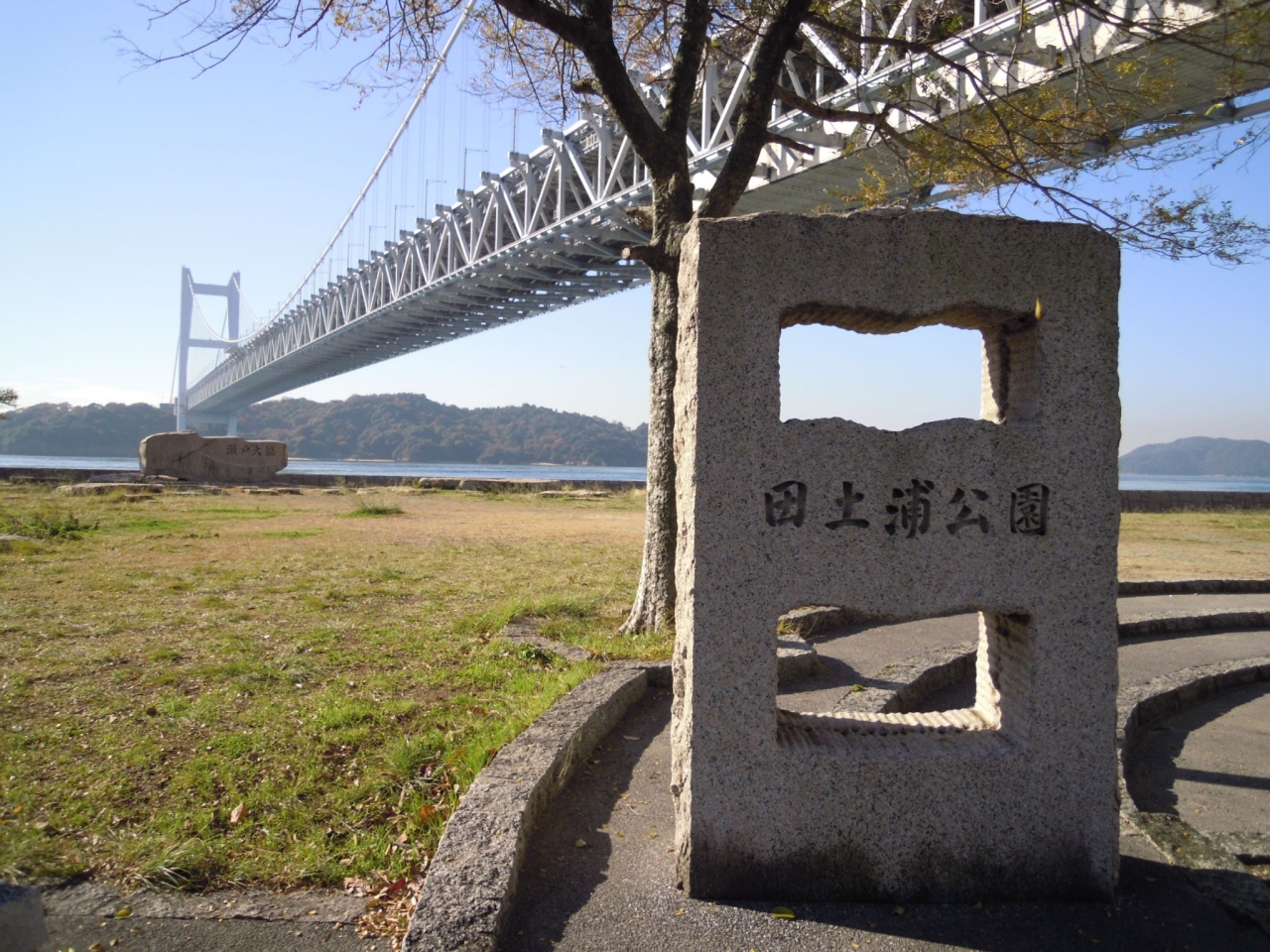 JR児島駅から下電バス・とこはい号(1時間ごとの運行・1日乗車券520円)で「田土浦公園前」下車(乗車時間約21分)。瀬戸内海に面した綺麗な公園で釣りを楽しむ人もいた。