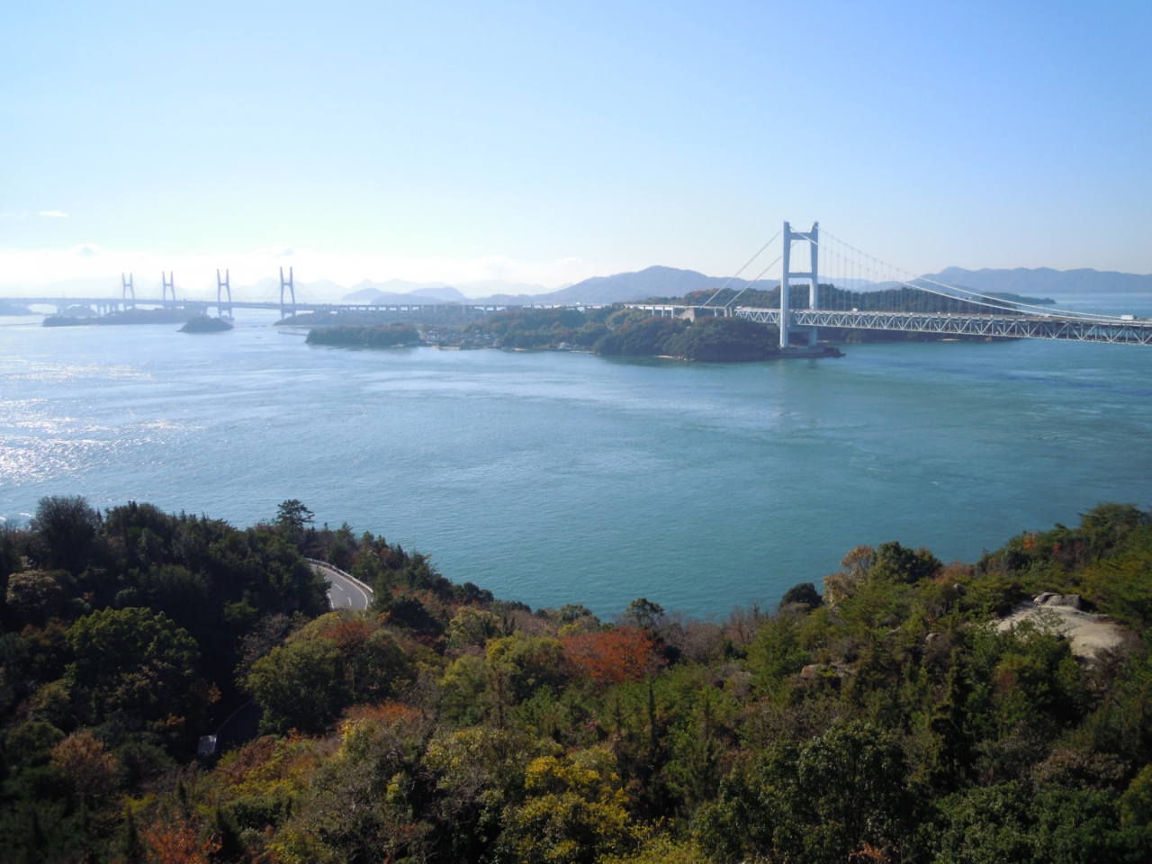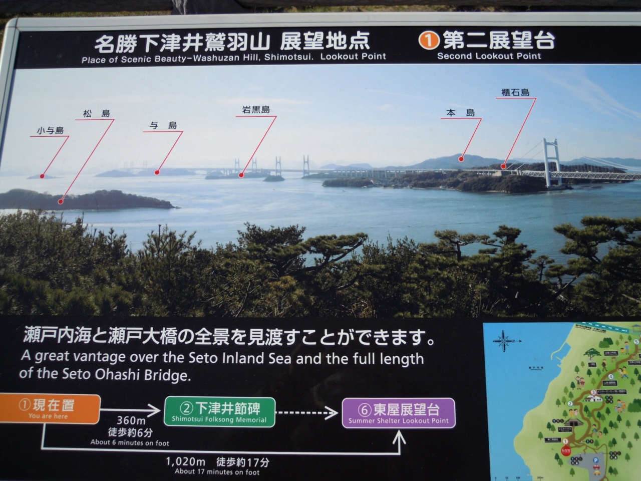 JR児島駅から下電・とこはい号(一日乗車券520円)で鷲羽山第二展望台下車(所要時間約29分。133mからの高台からは瀬戸大橋を繋ぐ与島をはじめ、美しい島々がみごとな景観を眺めさせてくれる。近くにはレストランもあり時間を忘れて美しい瀬戸内海国立公園を楽しむことができる。
