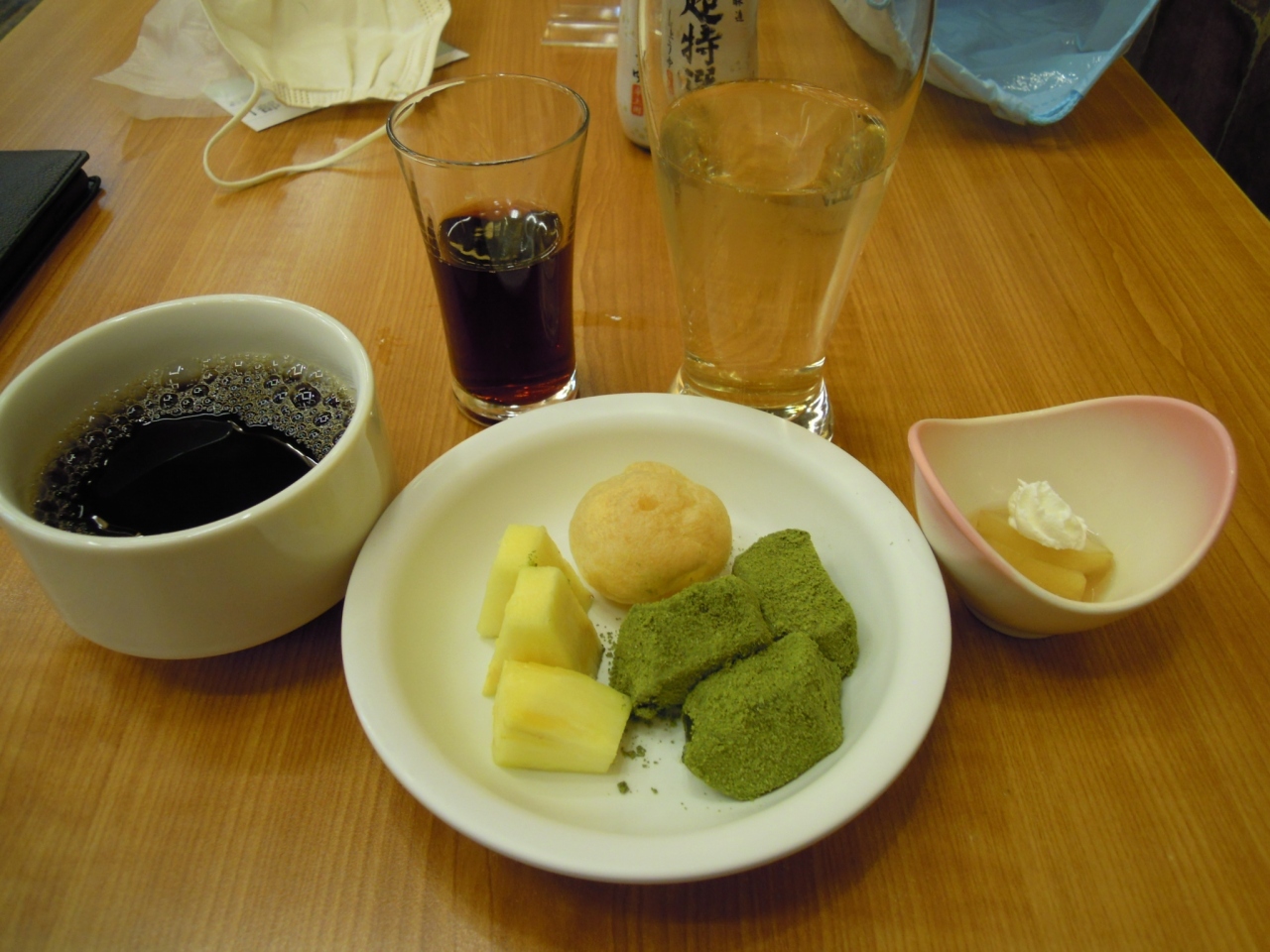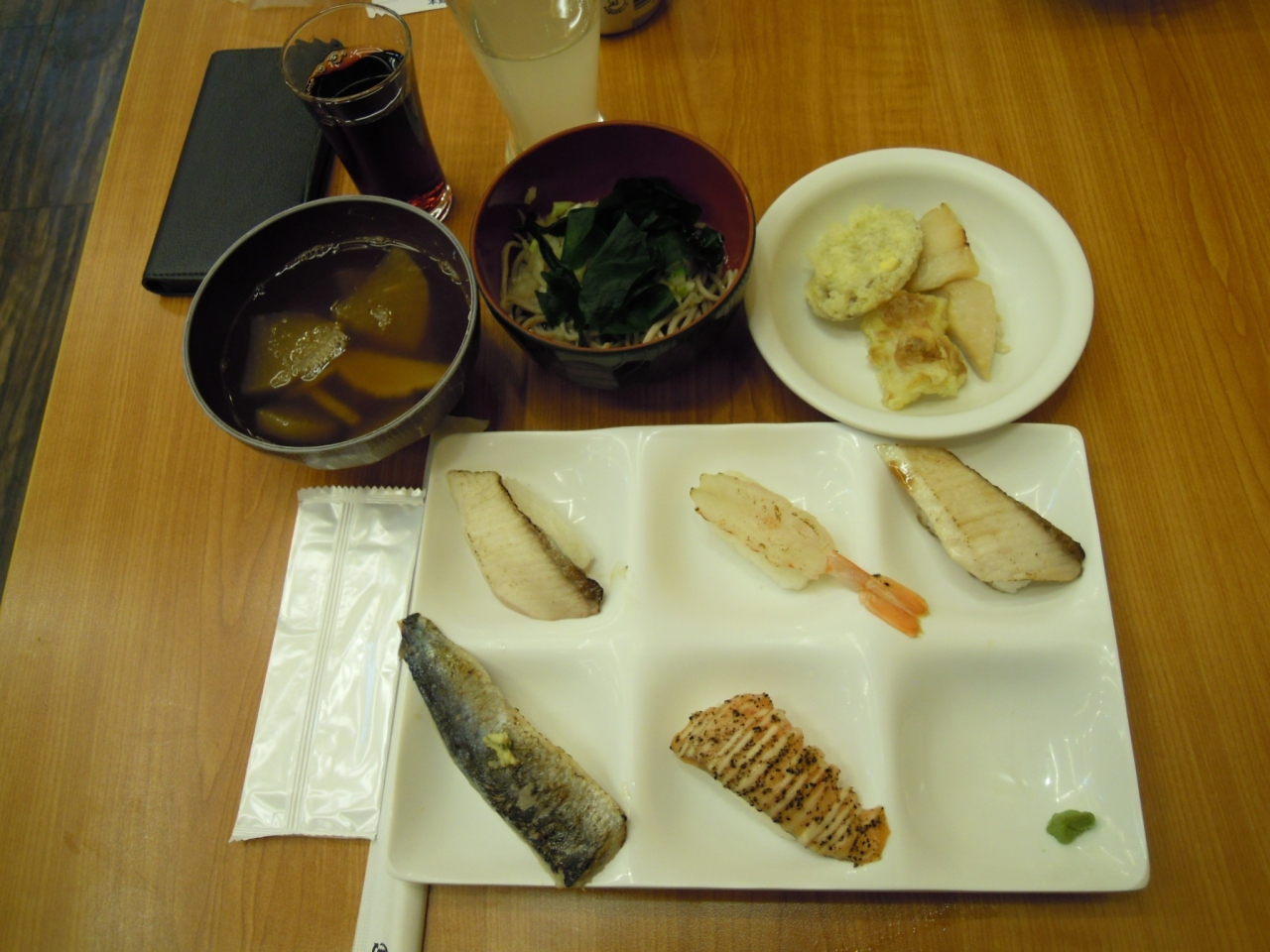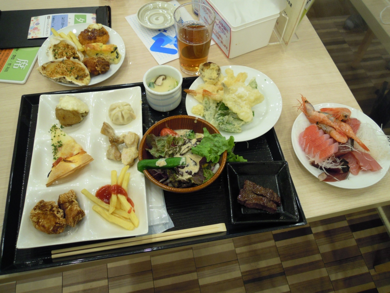 楽しみな食事はほんとうに豪華で、食材が実に豊富。目移りして何回もお盆を手に取りに行く。金目鯛の船盛りは美味。