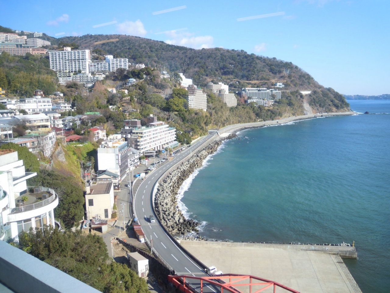 熱海駅より送迎バスで約10分。伊豆山の高台に建ち、相模湾が一望できるロケーション抜群なリゾート温泉ホテル。特にロビーからの眺めは最高。