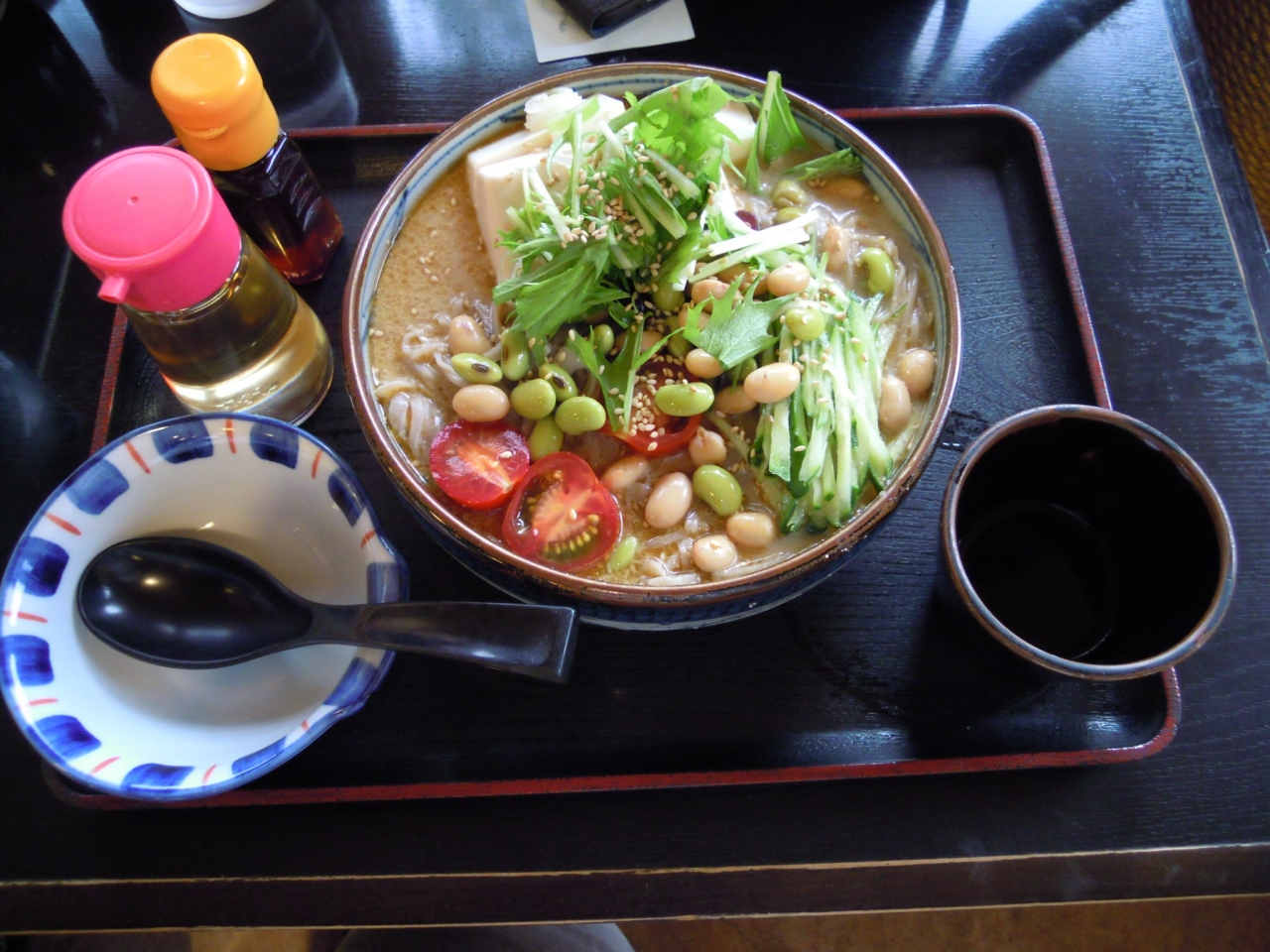 そば屋のそばの量は少ないので、「ぶっかけ冷し豆沢山そば中盛」を注文。出てきたその盛り付けを見て驚愕、「すごい!」、腹ペコ状態だったので軽く食べられるかと思いきや、最後はお腹がはち切れそう。びっくりしながらも好みの味に舌鼓を打ちました。- 旅行時期