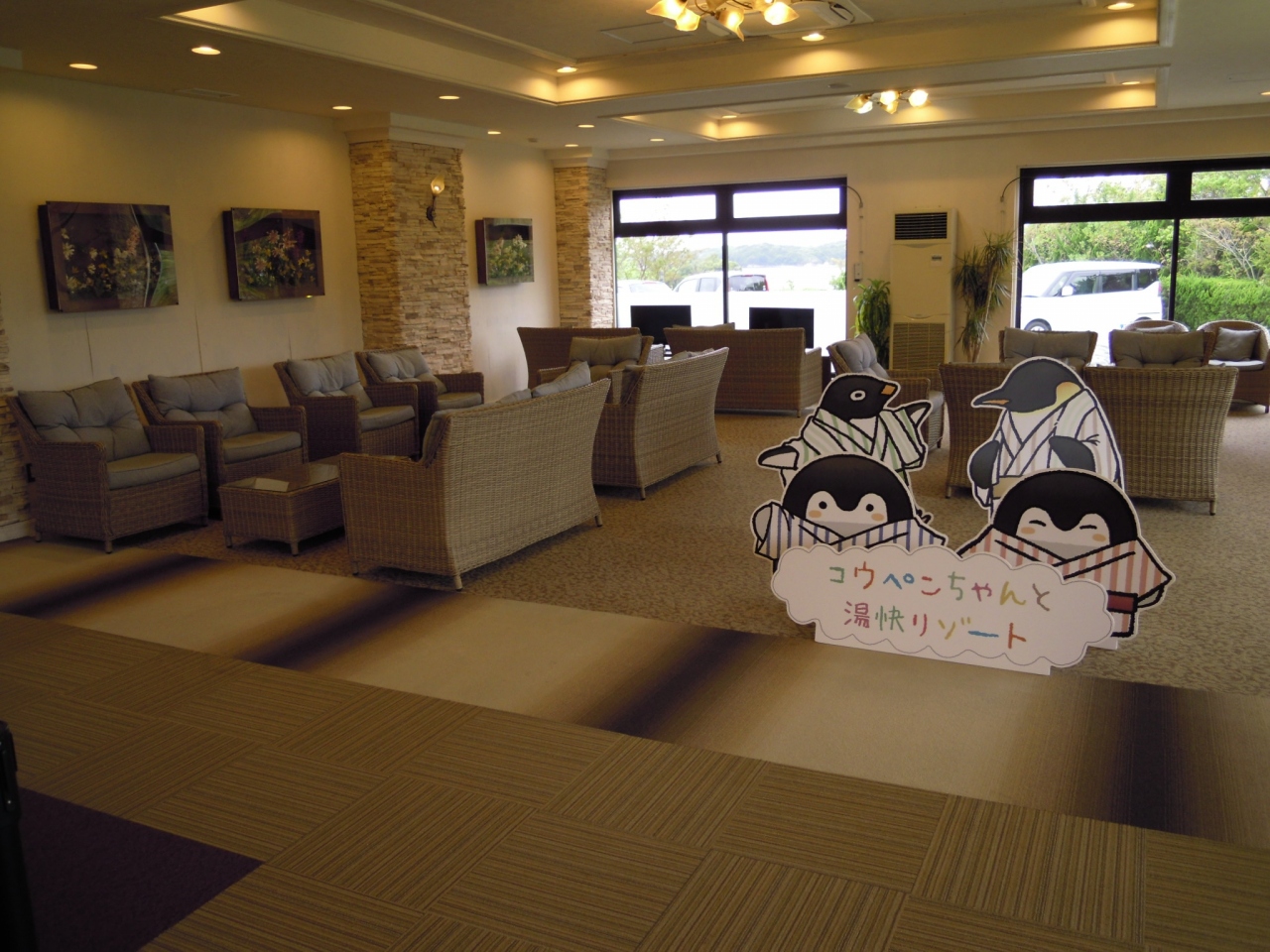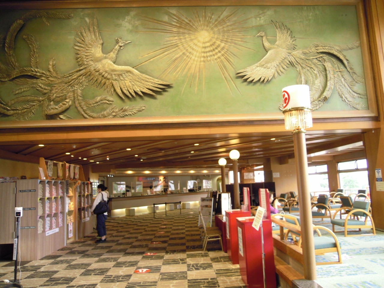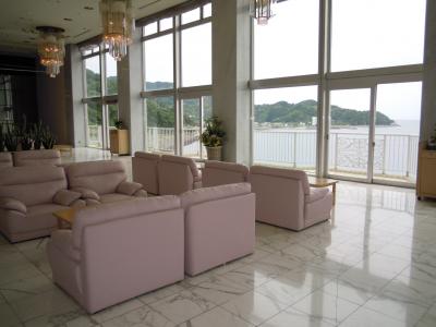 修善寺駅から東海バスに揺られて約50分、バス停「通り崎」下車すく゜前にホテルがある。断崖絶壁に佇む絶景のホテルで館内ロビーはゆったり海が眺められるソファー。