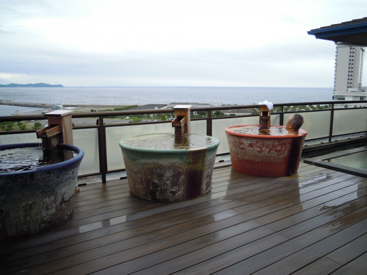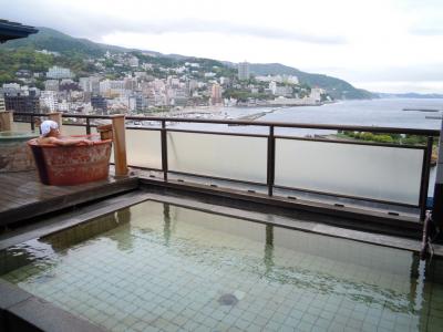 お風呂は南館11Fに展望露天風呂と五右衛門風呂3つ、大浴場は本館8Fにあり何れも熱海港や沿岸のホテルが眺められ、特に夜景が美しい。