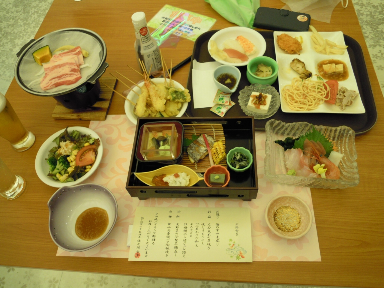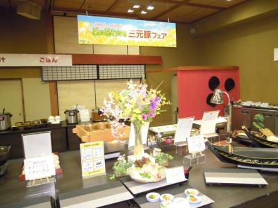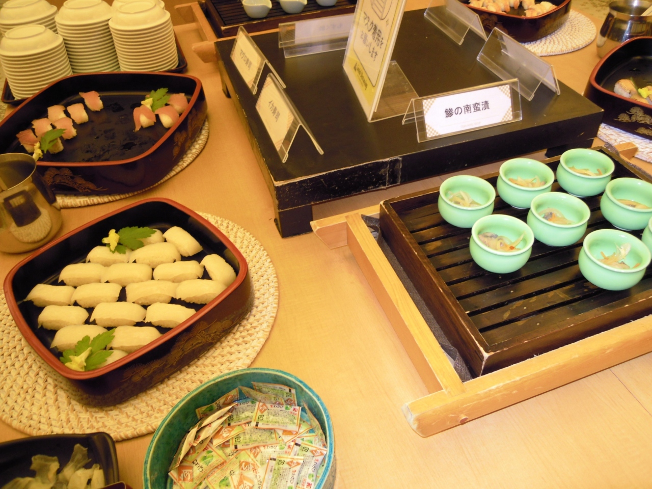 待望の夕食は会席料理でお品書きにもあるように地元の食材がふんだんに織り込まれていて美味でした。朝食は和食・洋食のブッフェスタイル、品数も多くおいしくいただけました。