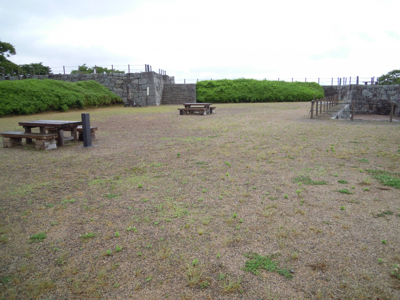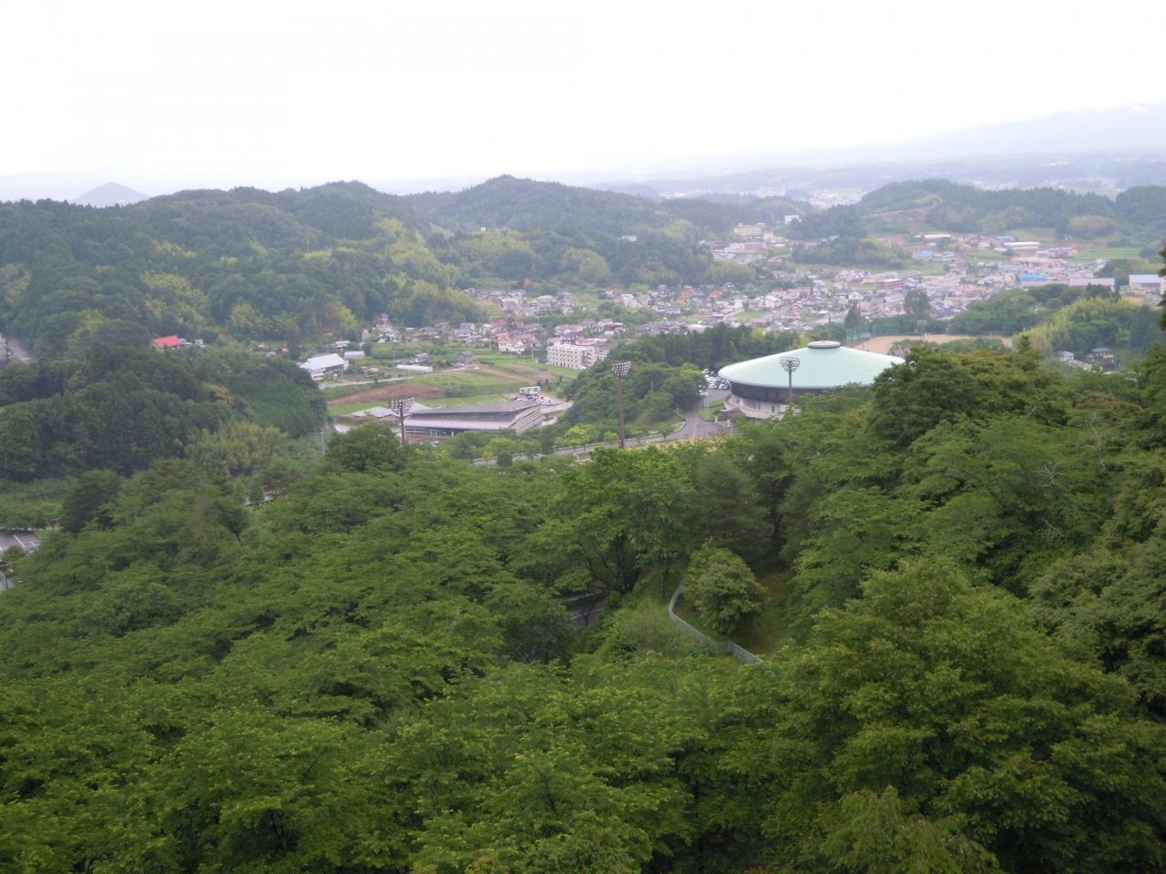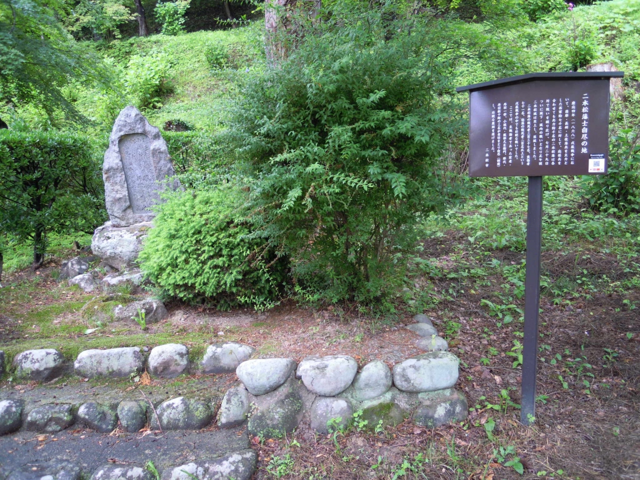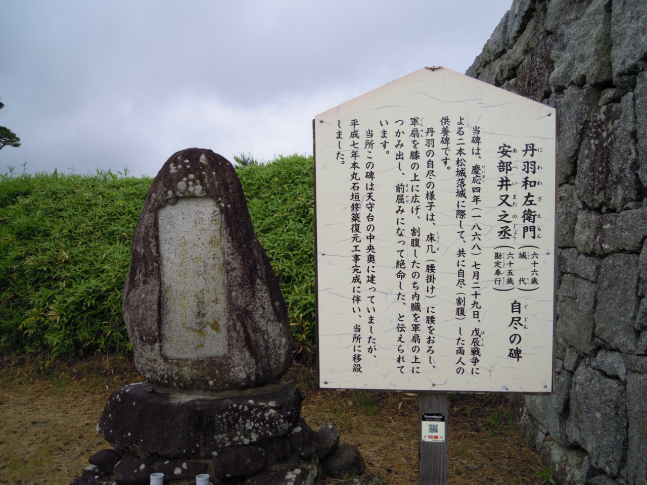 二本松駅から徒歩20分、それに雨模様。タクシーを利用せざるを得ない状況(往路1150円・復路790円)。往路では一番高い本丸跡まで行ってもらい、そこから見学しながら下るようにした。本丸跡は現在標識(2名の自尽の碑)と石垣のみが残っている。