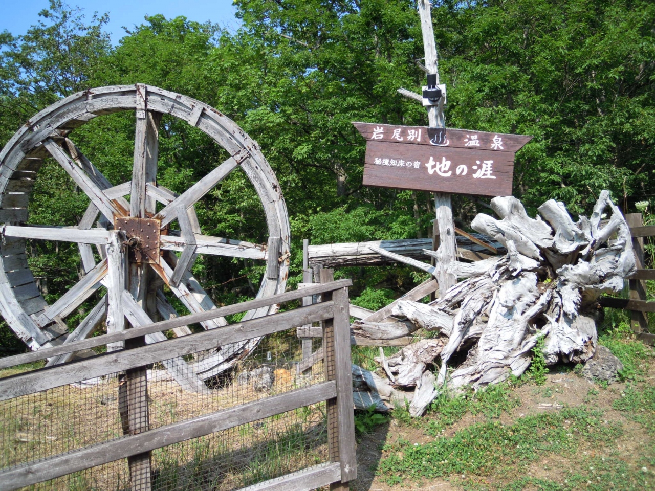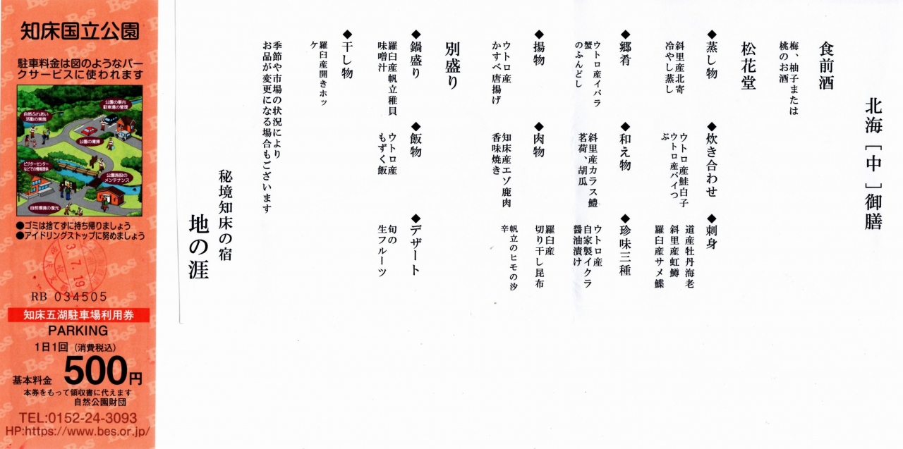 ウトロから車で約20~30分。舗装はされているが、辺りは原生林(熊も出そう)、正しく地の涯に相応しい。フロントで館内外の説明を受けて、早速楽しみなホテル外にある野趣満点な「三段の湯」(上・熱い、中・適温、下・温い)と「滝見の湯」(熱い)へ。囲いもなくクマが出そうな自分風呂に満足。ホテルに戻ってまた入浴、「庭園露天風呂」(混浴)を期待していたがここも熱く長湯ができない。