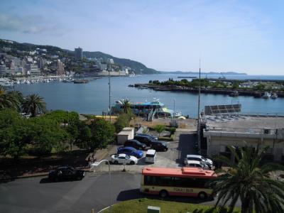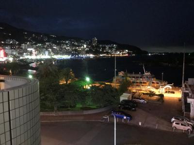 熱海駅からホテルの無料送迎バスで約10分で到着。熱海港に面したロケーション抜群なホテル。部屋は海側洋室ツインルーム(ベランダあり)。一人旅ではゆったり寛げる。