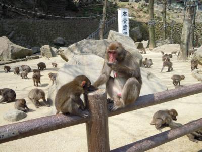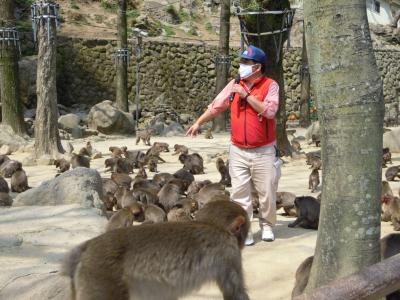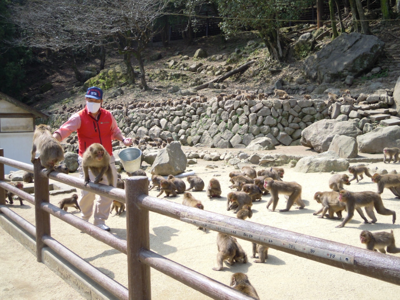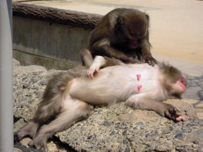最大の見ものは30分おきに繰り広げられる「餌やり」(生の小麦)、係員さんの見事な解説後にサル寄せ場一面に蒔かれて、一斉に群がる様はすごい迫力、さらにすごいのは大好物のサツマイモをリヤカーで底穴から落とす時はもう圧巻。何時間いても飽きることなく楽しませてくれた。毛繕いしている時、子ザル同士のじゃれ合いなど可愛い面も観察でき