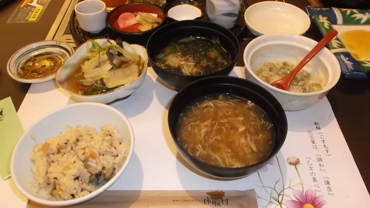 夕食は品数多くボリューム満点(写真を見れば一目瞭然)、桃も丸ごと1個、大食漢の私でさえ全部食べ切れないほどでとてもうまい。
