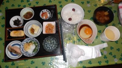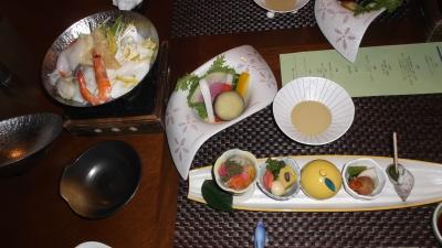夕食は創作和洋会席コース、朝食は和食膳で品数も多くお酒も進みました。