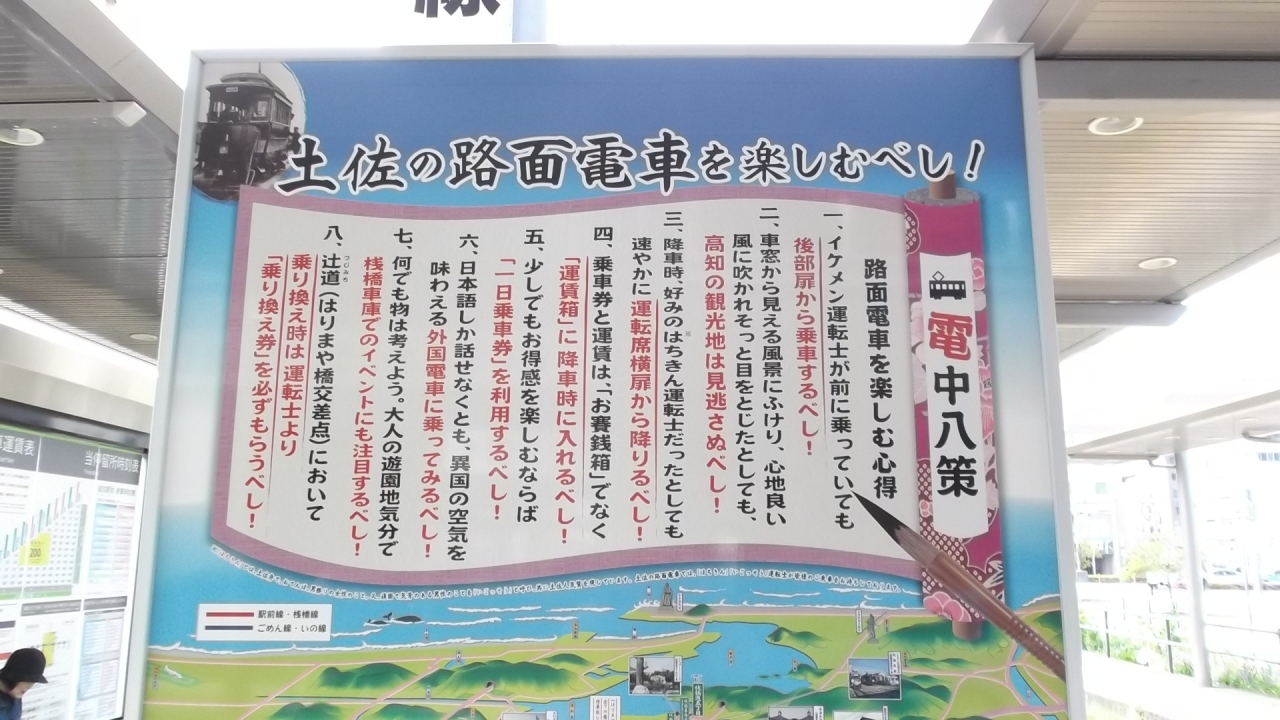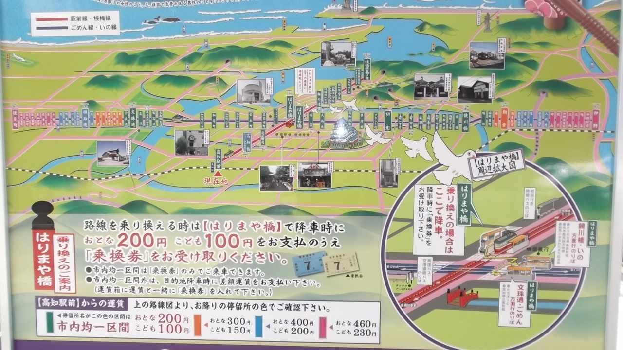 JR高知駅を起点に東西南北に走る高知市民の足となっている。ボディカラーはいろんな種類があって2両連結車も走っていた。1区間200円、後乗り・前降りで一日フリー乗車券も発売している。はりまや橋で乗り換える場合は、必ず運転士より乗換券をもらうべし。