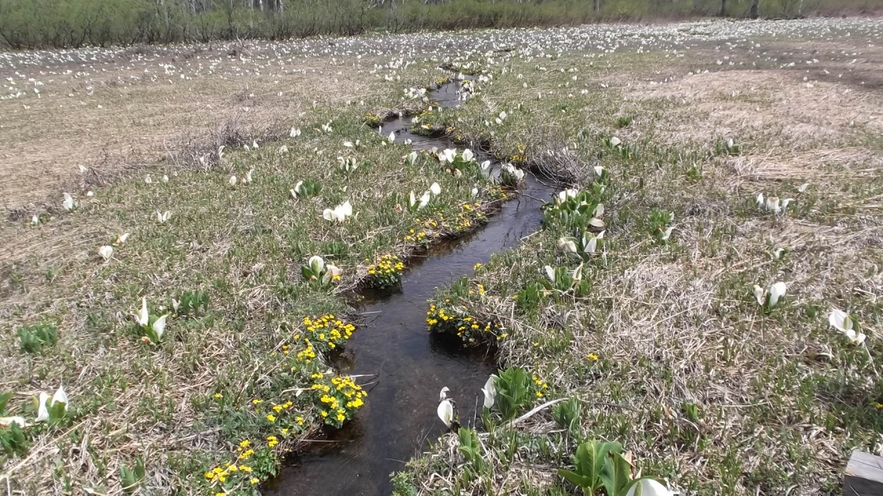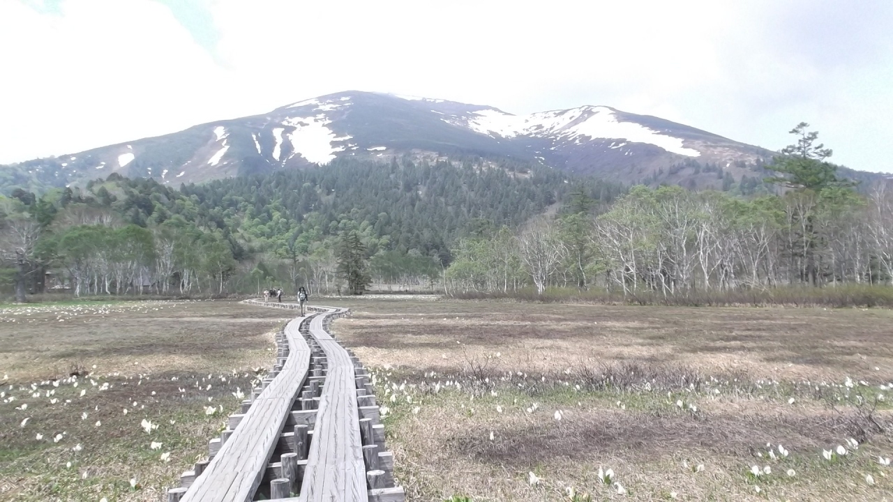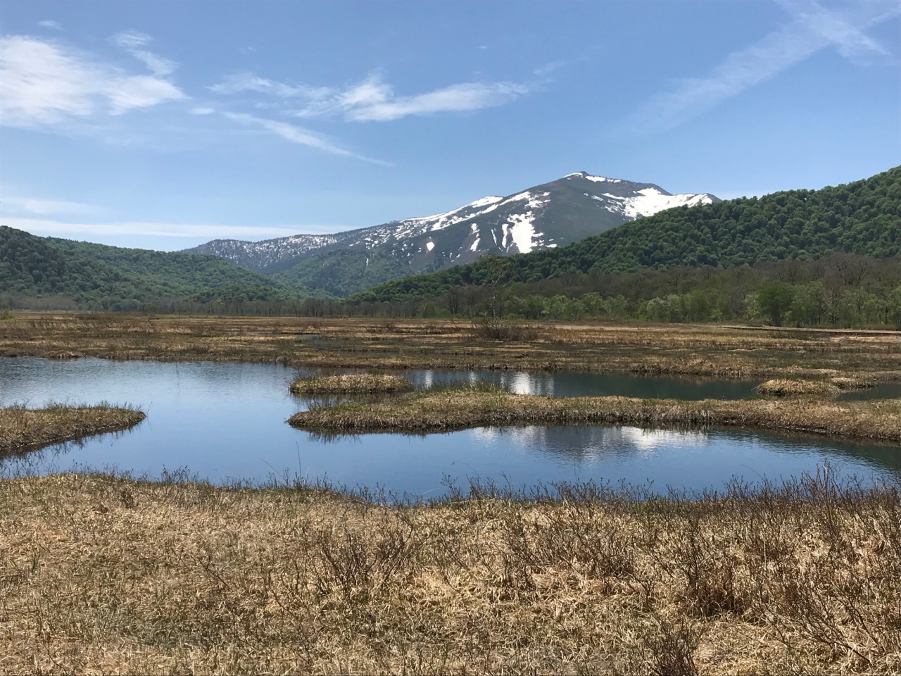 全17.0km・区間標準タイムは6時間25分と書かれてましたが、我々は約5時間でハイキングしました。途中の水芭蕉群、遊歩道を歩きながら後ろを振り返るとまだ一部雪を頂いた至仏が…、また前方には絶景の沼の向こうに燧ケ岳が眺められました。また帰路の途中にはサンショウウオを発見。