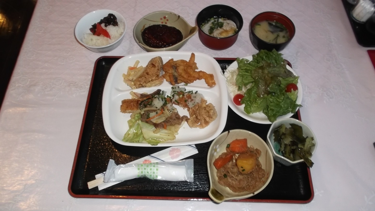 18:00からの夕食は1番乗り。ずらっと並んだ余りの品数の多さにびっくり。食材の写真を撮らせてもらい夕食が始まった。お代わりしながら取ったお盆が4つ目、お腹がはち切れそうになった。芋焼酎と冷酒も進みました。- 旅行時期