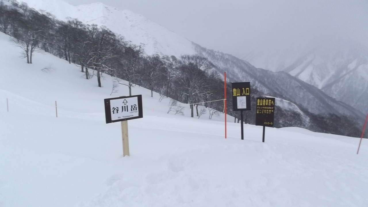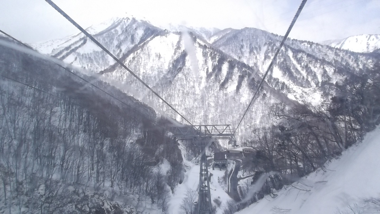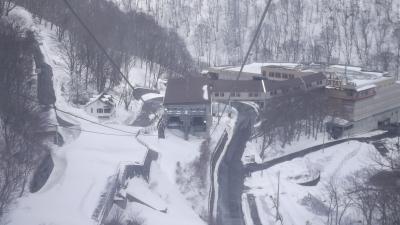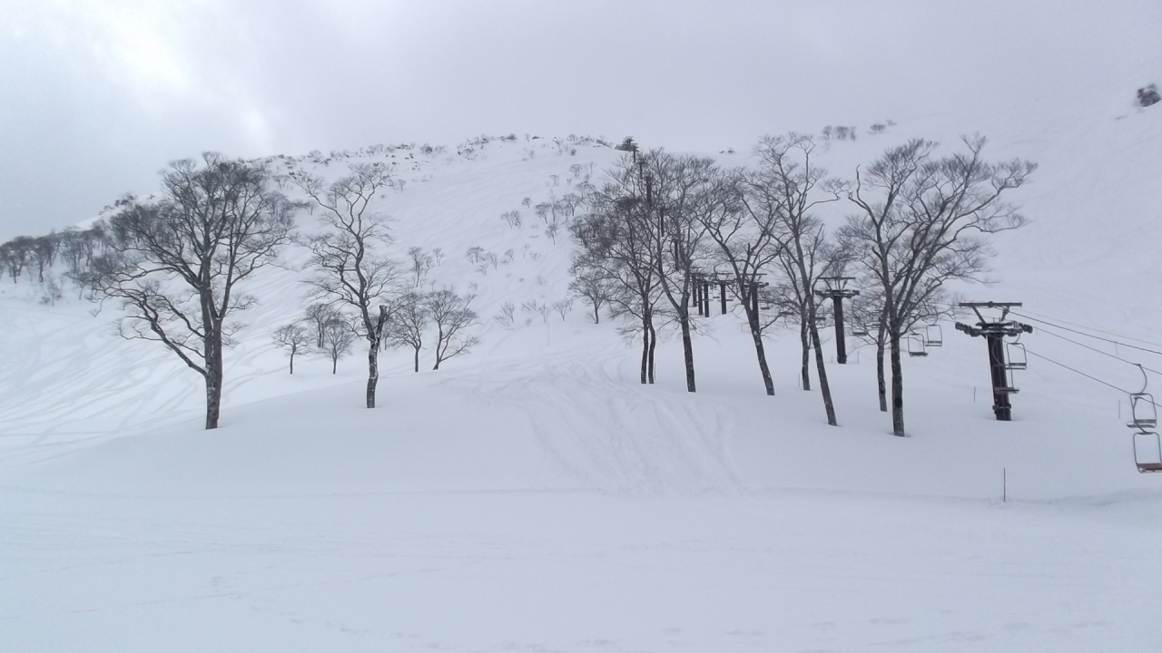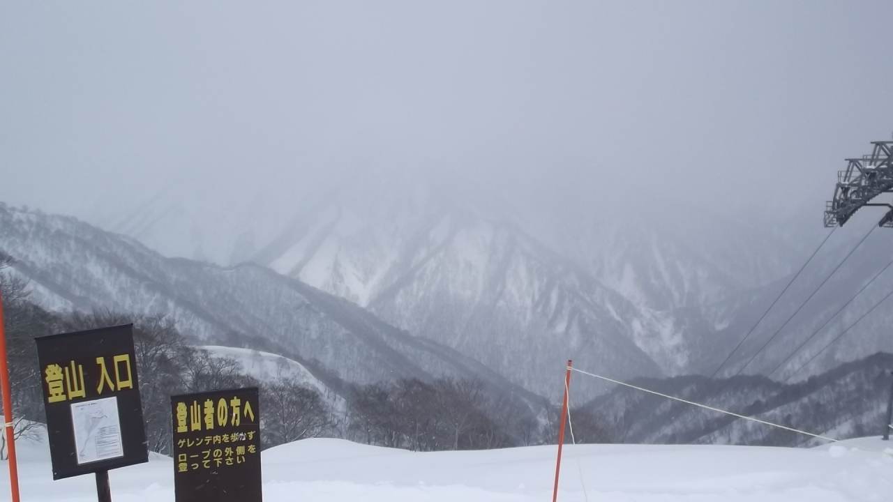 スキーヤーやスノーボーダーがまばらに滑っていた。遠くに谷川岳が雲に霞みながら見えていました。- 旅行時期