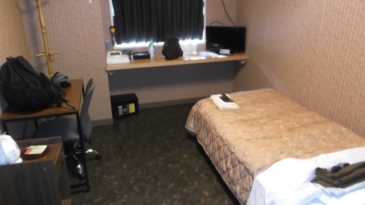 シングル洋室10㎡の部屋、大浴場はジェットバス・サウナ付で旅の疲れを癒してくれました(男性入浴時間18:00~23:30,6:00~9:00)。夕朝ともに入浴できるのは嬉しい。