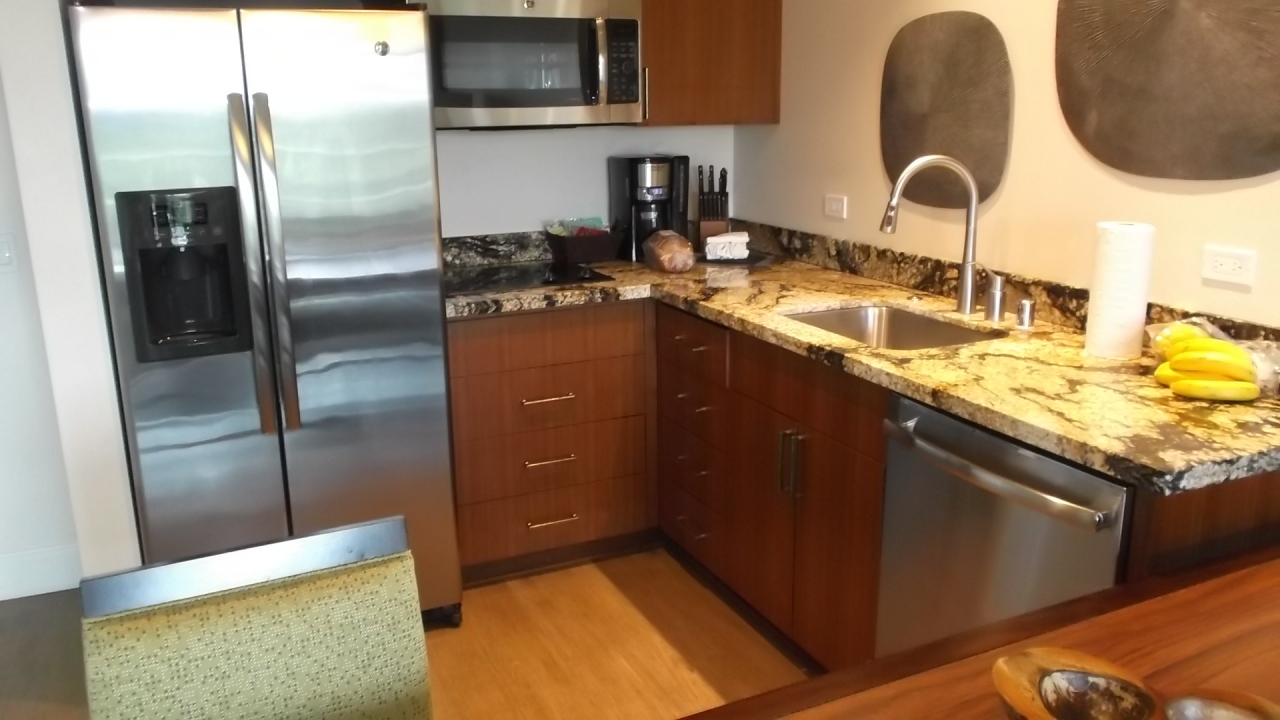 部屋はハワイアンアートと装飾品で彩られ、クライニングチェアとダイニングテーブルがある。ダブルサイズベッド2台、バスタブなしで広いシャワーと洗面台付のバスルーム。そして独立したリビングにはクイーンズサイズのソファーベッド、ハイビジョン薄型テレビ、DVDプレーヤー、ステンレススチールの電化製品のあるフルキッチン(レンジあり)、食器乾燥機、金庫、洗濯機と乾燥機が完備され至れり尽くせりです。