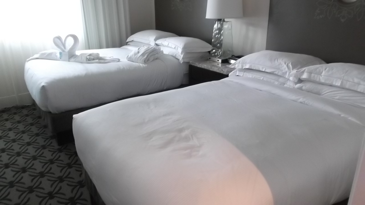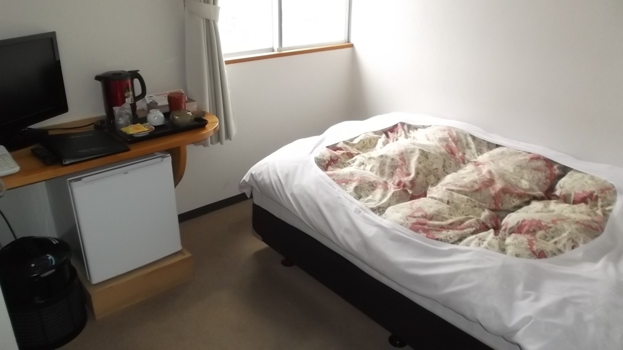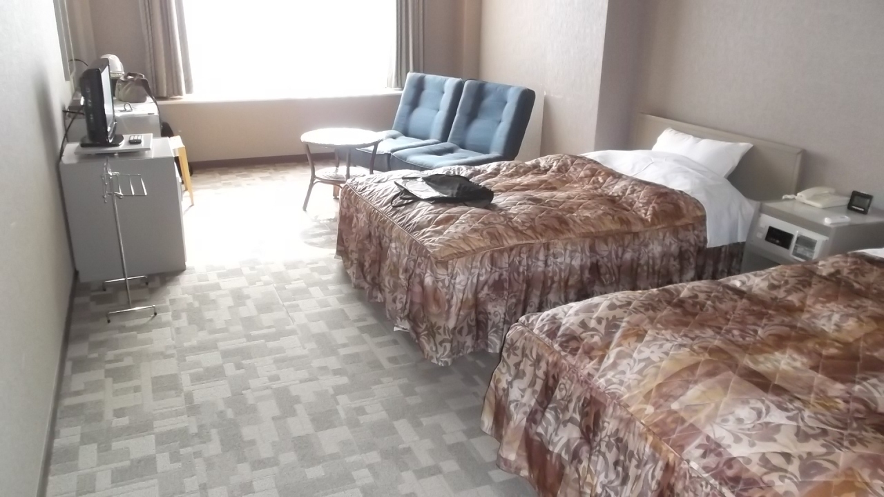 フロントで丁寧な説明を聞いて部屋へ。広々としたツインベッドルームは一人旅にはうれしいサービス。