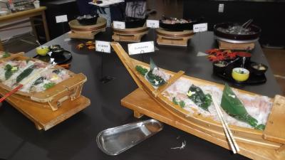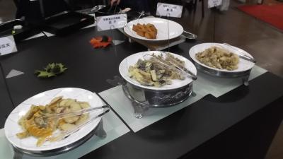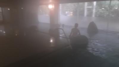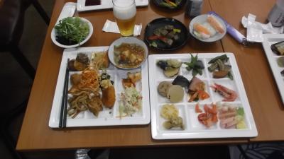 夕食はすごい種類の豪華バイキング、お盆2つに盛り付けた料理に舌鼓。それにビール・焼酎・地酒・お燗酒・ハイボール他、多数のアルコールの飲み放題は実に嬉しい。