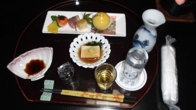 〔平日限定企画〕お手頃価格で2食付ビジネスプラン、魚料理中心の5品+越後の旨い地酒飲み比べセット864円注文。一人旅には十分な味わいでした。- 旅行時期