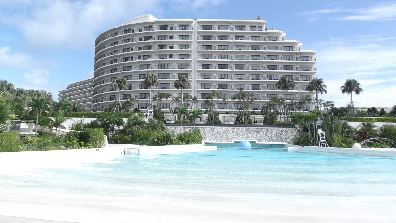 恩納村の西部にあり豪華な外観にクラシック風の佇まいで清潔感満点。荷物は別にポーターが部屋まで運んでくれます。プライベートビーチ(タイガービーチ・シュノーケルは出来ない)に屋外プール(ロケーション抜群で子供用の波のプール)もある。またジム・スパ(温泉大浴場)・屋内プールも完備されている。