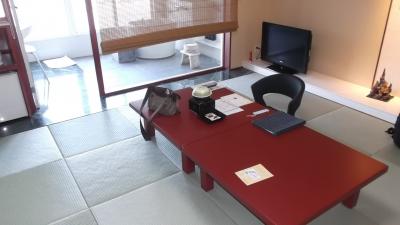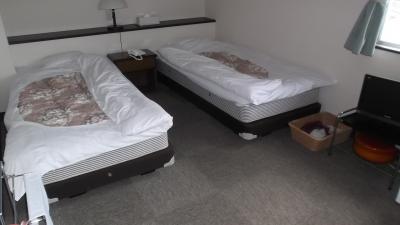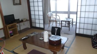 紀伊田原駅から予約していた送迎マイクロバスで数分。海岸に面した国民宿舎でホテル前には公園が整備されている。部屋は残念ながら海とは反対の山側2ベッドルーム+バス・トイレ・洗面所が次の間にあった。