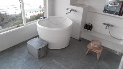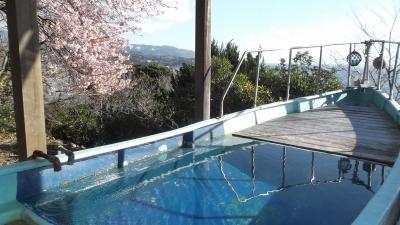 某旅行社の無料宿泊券(2食付)をゲットして訪問しました。国道135号から少し狭い道を上がったところにあり、海が綺麗に見えました。ちょうど河津桜が見ごろで舟形の露天風呂に入りながらの桜や海の絶景が臨めました。