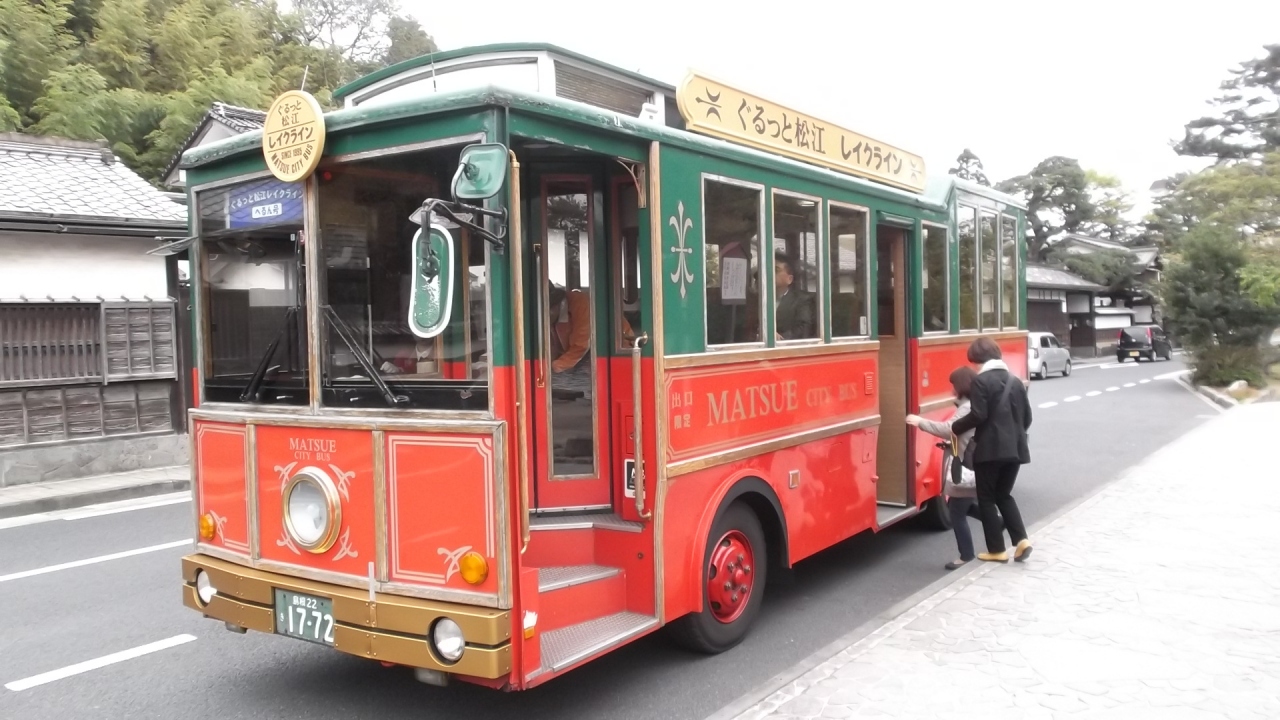 JR松江駅、しんじ湖温泉駅、松江城、小泉八雲記念館など主だった観光スポットを約20分間隔で結んでいる可愛い赤バスで、乗務員(運転手)は所税が多かったような気がします。車内はレトロ調でゆっくり走行しています(小泉八雲記念館~しんじ湖温泉駅=200円)。