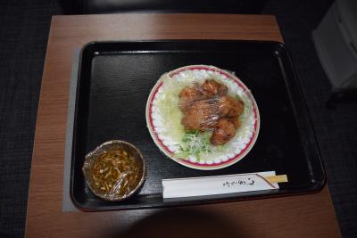 土曜の宿泊で、翌早朝に館鼻岸壁朝市に行くため八戸での素泊まりにした。と言っても、日替わりで夕食料理を単品で頼めるので、それにした。土曜日は鶏の唐揚げで6個ぐらい皿に載ってキャベツも添えられていた。添付の特製ソースをつけて、美味しく頂いた。