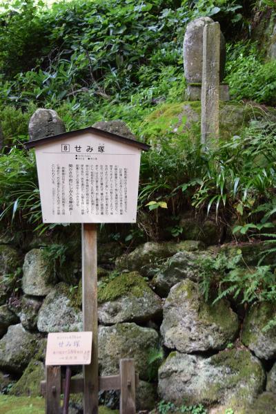 せみ塚の掲示板には「芭蕉翁の句をしたためた短冊をこの地に埋めて、石の塚をたてたもので、せみ塚といわれている。」と記載されている。ここでちょっとだけ休んで『閑かさや岩にしみ入る蝉の声』の句をかみしめて、また登っていった。- 旅行時期
