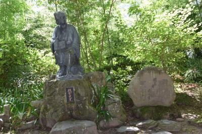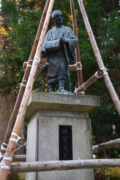 山寺は2度訪問し、芭蕉と曾良の像は2回とも見ているが、寄贈者が(株)でん六社長父子だということを最近知った。なぜ寄贈者がでん六社長父子なのか?(株)でん六は山形市に本社を置き、「地域への恩返し」として、(株)でん六創業者の鈴木傳六氏が1972年に芭蕉像を寄贈したそうだ。その後「おくのほそ道紀行300年」を記念して1989年に息子さんの鈴木伝四郎さんが建立したそうだ。実際の芭蕉像と曾良像は数メートル離れており、一枚の写真に収めようとすると結構大変だった。芭蕉像の右側に石碑があり、そこには「せみ塚」と同じ「閑さや岩にしみ入る蝉の声」の句が彫られていた。