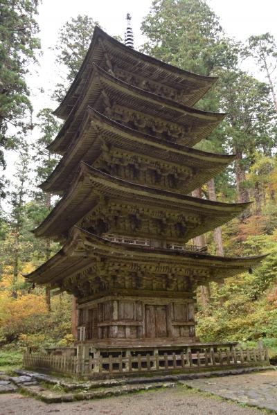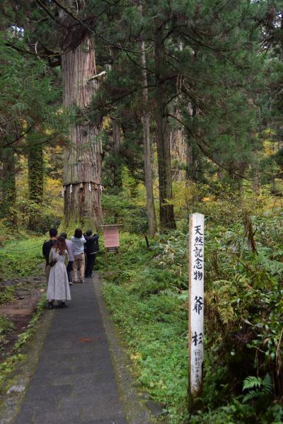 鳥居の手前右側に「羽黒山 月山 湯殿山 出羽三山神社」という碑があって、鳥居をくぐって進むと、朱色の随身門がある。随身門を進むと、下り坂の石段が続く。随身門から羽黒山頂までの1,7kmの両側には杉並木が続くが、これは国の特別天然記念物ということだ。その後、参道の両側に小さな神社がある所を通ると右側に滝が見え、工事中の個所があった。更に進むと、羽黒山の爺(ジジ)杉というのがあり国の天然記念物に指定され、羽黒山では最大最古の巨木ということだ。その爺杉を過ぎて更に進むと、国宝羽黒山五重塔が見えてくる。ここでしばらく写真を撮った後、時間が押しているという理由をつけて、頂上登山は断念して随身門方面に引き返した。