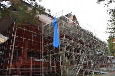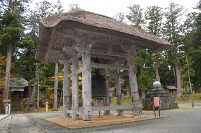 境内には大小いくつかの社殿があり、国の重要文化財である三神合祭殿は御屋根御修理中だったが、参拝できた。少し離れた所から三神合祭殿の屋根を含めて眺めると、その立派さがよくわかった。境内には蜂子社、厳島神社という小さな社殿もあり、周囲を木の棒で囲っており、これは時節柄冬囲いだろうか。また鐘楼と梵鐘は国の重要文化財に指定されていた。