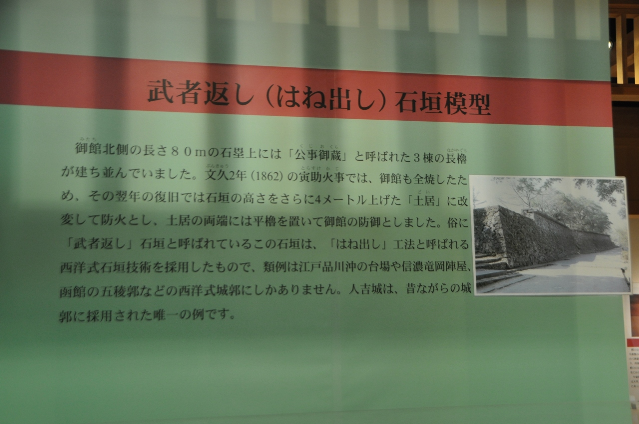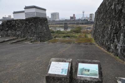 人吉城歴史館でいろいろなことを知った後、人吉城跡に向かった。昭和36年に国の史跡として指定を受けた人吉城跡は、史跡の管理団体となった人吉市によって、保存修理、櫓や長塀の復元等の整備が行われた。当時の建造物として現在は石垣が残っている。天正17年(1589)には人吉城の大改修が行われ、新時代の技術である石垣造りの城となり、この石垣造りの城は急流・球磨川とその支流を天然の濠とする「川の城」でもあった。その船着き場や、武者返しの石垣は今も見学できる。