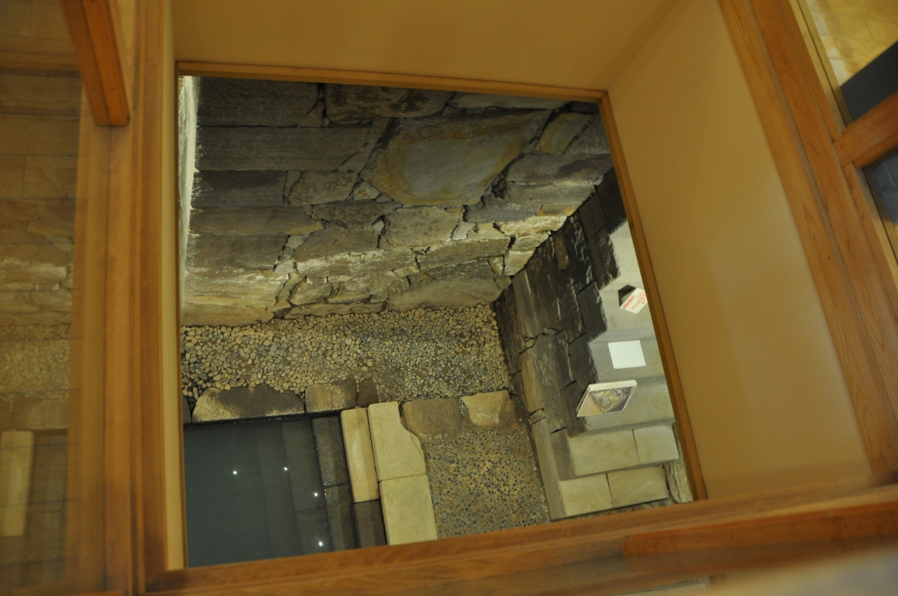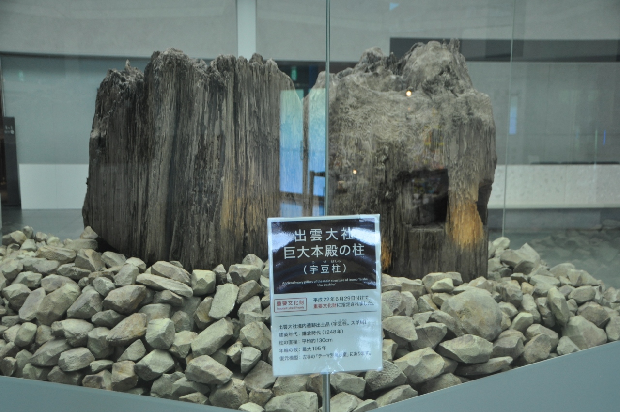 入館して1階ロビーに入って中央付近に鎮座しているのは、出雲大社巨大本殿の柱(宇豆柱)で、出雲大社境内遺跡出土品として国の重要文化財に指定されている。説明文には「平成12年の発掘調査で径1,4mのスギ材が3本出土し、想像を絶するこの巨大な柱はどのような神殿を支えていたのであろうか。」と書かれ、それを検証・解明する展示物が館内に集中していた。