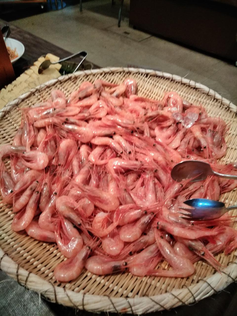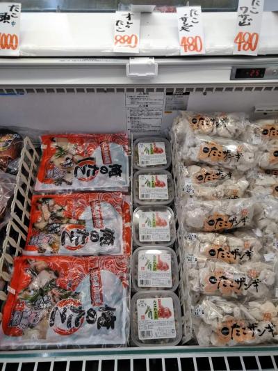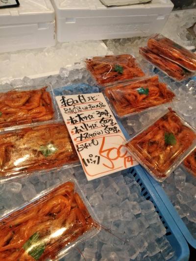 朝9時頃にホテルを出発して、お土産購入のために羽幌の渋谷水産に立ち寄った。場所は、羽幌から国道を増毛に向かって南下すると右側で、北のにしん屋さんという海鮮食堂と併設している。渋谷水産直売所の中に入ると、ちょうど朝獲れた甘エビをパックに詰めて売り場に出しているところだった。見るからに新鮮だったので1パック購入。そして、たこわさびとたこの珍味などを購入した。