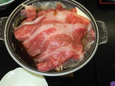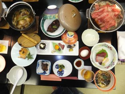 JRかみのやま温泉駅に到着すると、ホテルの方がマイクロバスで迎えに来てくれた。ホテル到着後も丁寧に接客していただき、同僚数名で宿泊し夕食時はスタッフの若いおねえさんが和服姿で給仕してくれた。名物の芋煮と米沢牛のすき焼きが出て、おいしく頂いた。