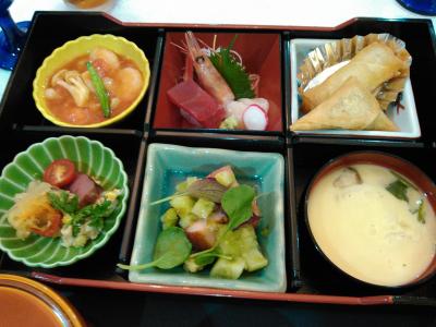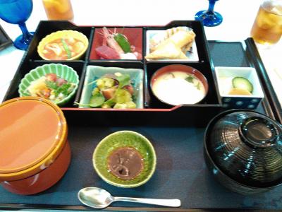 キャッツを見る前に同僚数名と利用した。個室に案内されると、オシャレなブルーのグラスが用意されていた。中の水も青く見えた。ランチは6種類に区切られた弁当箱におかずが入っており、ライスと味噌汁が付く。お茶やジュースは、おかわり自由。ランチや飲物を運んでくれたお姉さんは、とても感じが良かった。どれも味付けが良く、おいしく頂いて、最後に「いちごコンポートアイス」がきてこれまたおいしく、満腹状態でキャッツを見に行ってしまった。- 旅行時期