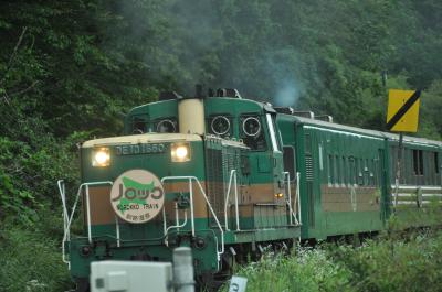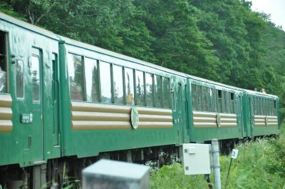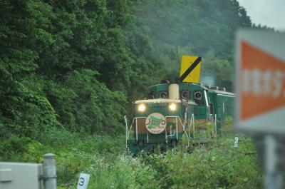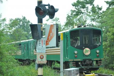 細岡展望台から国道391号線に戻る途中、車が何台か右折していき、何かな?と思っていると、右手の方に駅舎が見え、JR細岡駅だった。「車が何台も入っていくということは何かあるのかな?」と思いながら、釧路川のカヌー発着所で車を停めて、しばらく川の風景などの写真を撮ったりしていた。そのうちにカヌー発着所近くの踏切で遮断機が下りてカンカン鳴り始めた。「何だろう」と思ってカメラを片手に行ってみると、細岡駅に列車が停まっているようで、しばらくするとこちらにやってきた。そして緑の車体が近づいてきて、ノロッコ号だとわかった。ノロッコ号とは釧路湿原を走るおもちゃのようなローカル列車かと思っていたが大違いで、立派な観光列車だった。車内の人たちは皆カメラを持ってこちら側、つまり釧路川の方に向かって窓から写真を撮っているのが、よく見えた。