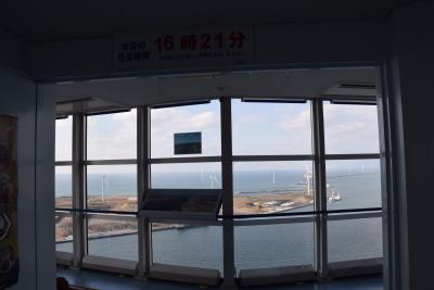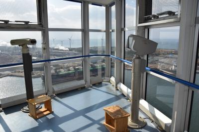 バスで往復するにはなかなか大変かもしれないが、見晴らしは最高! エレベーターに乗ると、あっという間に地上100mの高さに到着する。展望台ではガラス窓越しに、港湾や大型タンカー、そして住宅地の様子などを眼下に見ることができた。基本、高い所が苦手な自分だが、遥か遠方を見るのはそう恐怖を感じないようだ。展望スペース壁面には、ベストショットの写真が多数展示されていた。