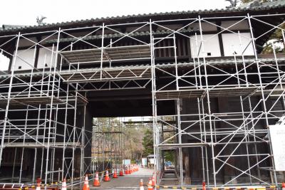 今回は最勝院を見学後に行ったので、追手門から入った。追手門は修復工事中のため、鉄パイプに囲まれていた。カメラの望遠で見ると、確かに老朽化が進んでいた。