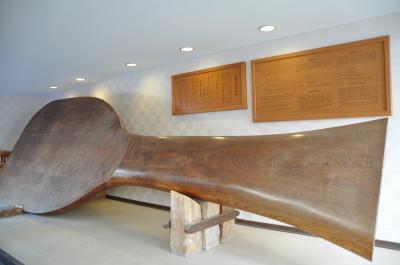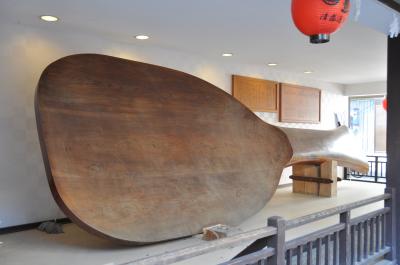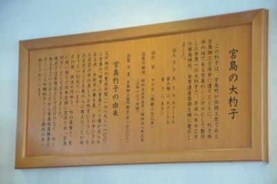 表参道商店街を歩いていると、長さ7,7m、重さ2,5tの巨大杓子が出現する。横には、「宮島の大杓子」の由来などについての説明用掲示物があった。それによると、宮島町が伝統工芸である宮島細工を後世に遺し、杓子発祥の地である宮島のシンボルとして製作した世界一の大杓子で、平成8年12月、厳島神社の世界遺産登録を機に展示したそうだ。なお杓文字(しゃもじ)と杓子(しゃくし)は別物だが宮島杓子は例外で、杓文字の形をした杓子、「富をすくいとる」「ご飯をすくいとる。飯取る」となり、これでご飯をいただけば福運を招くとして全国に広がったとのことだ。