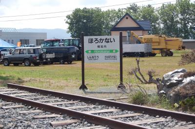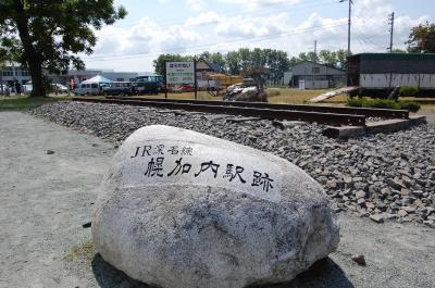 幌加内町で開催された新そば祭りに行ったときに見た。駐車場で車を停め、新そば祭り会場に行くときは「レールがあるな」ぐらいしか気が付かず、会場から駐車場までの帰り道で、石をバックに写真を撮っている人がいて「何だろう?」と思って見たのが、JR深名線幌加内駅名が記された石だった。他にはレールの一部と駅名票があった。そこはもともと駅があった場所かどうか等は不明だが、新そば祭りでは多くの人の目に触れる場所にあった。